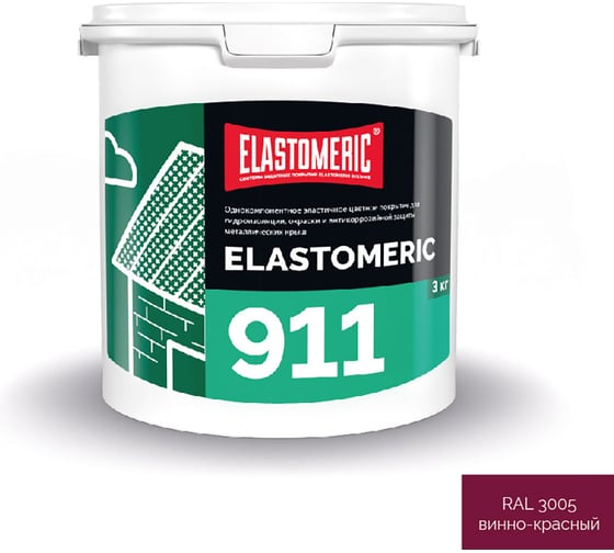 ELASTOMERIC-911 (RAL 3005) винно-красный – цветное покрытие с высоким сухим остатком. Разработано c использованием новейших достижений в области технологий полимеров. Предназначено для гидроизоляции, защиты от коррозии, окраски и продления жизни всех типов металлических кровель, таких как: алюминиевые, стальные черные и оцинкованные, с полимерным покрытием и ранее окрашенные.