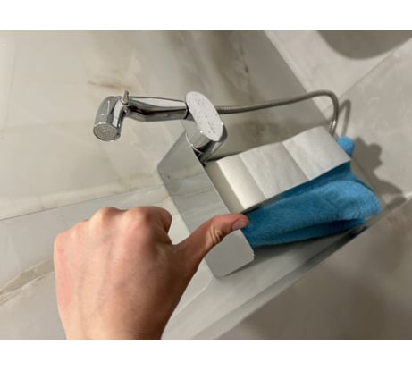 Весь продукт представляет собой удобную полочку, на которой можно разместить все, что необходимо вам под рукой. На интегрированном держателе можно размещать туалетную бумагу, а на крючке - полотенце.