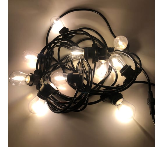 Черный каучуковый провод длиной 5 м оснащен 10 патронами с цоколями Е27, которые располагаются на расстоянии 50 см друг от друга.
