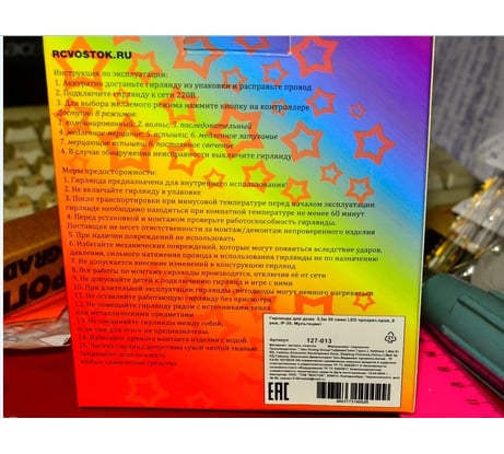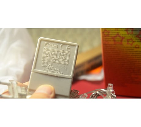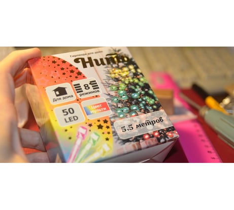 Новогодняя гирлянда НИТЬ (Серпантин) 5,5м, 50 ламп, мультицвет (127-013). Упаковка - глянцевая цветная коробочка из картона, со всех сторон разная информация, но по сути пустая. Внутри сама гирлянда, без пакетиков, доп. бумажек-инструкций, гирлянда прозрачная (и провод, и лед-лампы), а коробочка-программник из белого шершавого пластика, аккуратная, без заусенцев и прочих косяков, кнопка хорошо нажимается, программы как у всех - всё то же самое, 8 режимов и на самом корпусе коробочки они все расписаны. Прозрачная вилка с пометками - 250В и 2,5А, на коробке написано - напряжение на входе 220В, а на выходе 2,5В при 50-60Гц.