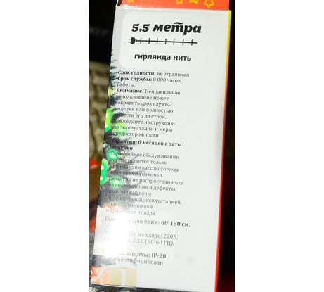 Хорошая информативная упаковка, сохраняющая товар. Прозрачная, а значит не особо видна, хотя празднично мелькает-блестит, может хорошо преломлять и отражать огромную часть света, этим самым может появиться эффект как бы частичного свечения самого провода. Буду накручивать её на ствол ёлки, так как она у меня пышная и густая, нужно изнутри подсветить.