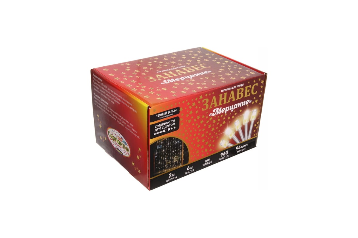 Гирлянда для улицы Серпантин ЗАНАВЕС "Мерцание" ш2.0* в6.0 м 960 ламп LED, прозрач.пров,1 реж.,IP-54, Теплый белый, белый мерцает (возможность соединения) 183-108