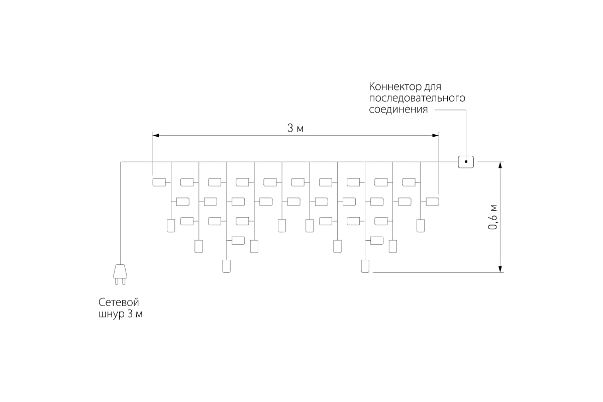 Шаг гирлянды между свисающими нитями 24 мм. Гирлянду можно соединять между собой, что позволяет нарастить гирлянду в длину. Степень защиты прибора (IP) - 65, где первая цифра обозначает пылезащиту, а вторая - влагозащиту. Чем выше числа, тем больше степень защиты гирлянды по данным показателям. Гирляндой данного вида можно украсить новогоднюю елку, окно, стену, зеркало и многие другие предметы внутри помещения, а также использовать для украшения дома снаружи.