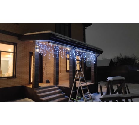 Хватило на переднюю часть веранды и чуть сбоку до колонны. Провода питания тоже точно хватило до розетки (розетка посередине гирлянды)