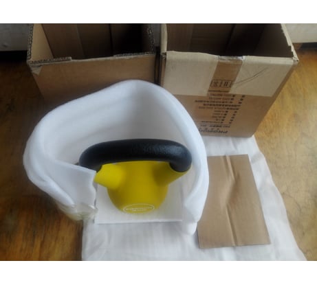 Миниатюрная, изящная, приятно брать в руки. Многие спрашивают, что лучше — НЕОПРЕНОВОЕ или ВИНИЛОВОЕ покрытие для гири. Если сравнивать тактильно, то неопрен значительно приятнее, он чуть упругий (как хорошая резина), поверхность матовая (чуть шершавая), ощущается тёплой — в сумме получается дофаминящая тактильность. У винила поверхность глянцевая, твёрдая на ощупь, холодная. По физической прочности ± одинаковые. А теперь вернёмся обратно к этой гире. Ручка внутри имеет ширину мужской ладони. Покрашена чёрной краской, снизу краска лежит немного неровно (в процессе тренировок отшлифуется). Упаковано очень хорошо: двойной картон, демпферы со всех сторон. Из минусов: на подошве торчит неопреновый пупырыш (см фото), чуть портит эстетику, хотя на устойчивость не влияет. ИТОГ: красивая, приятная на ощупь, так и манит позаниматься с ней.