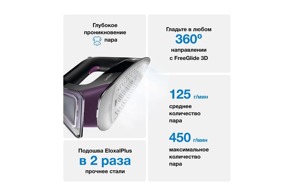 Гладильная система предназначена для ухода за одеждой. Модель оснащена подошвой со специальным покрытием, которая обеспечивает плавное и безопасное скольжение по одежде. Заостренный носик облегчает обработку вещей между пуговицами, воротниками и в других труднодоступных местах. Имеет большой объем резервуара для воды, чего достаточно для продолжительного использования.