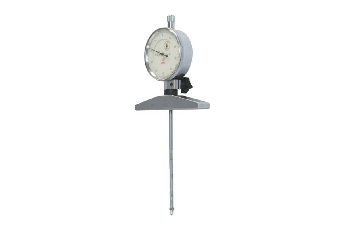 Предназначен для измерения глубины пазов, отверстий и высоты уступов, отличается высокой точностью измерений. В индикаторных глубиномерах отсчет показаний обеспечивает часовое устройство с ценой деления 0,01 мм, закрепленное на измерительной плоскости.