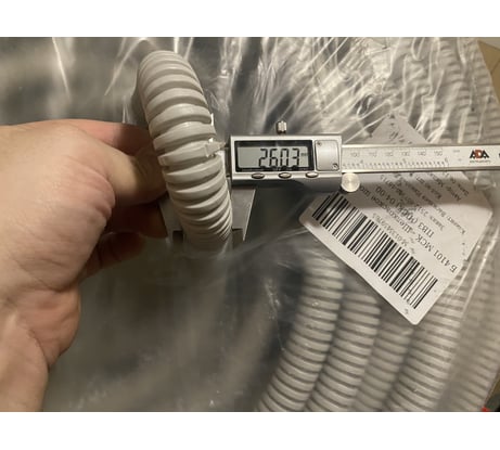 Гофра имеет диаметр 26-26.1 мм. Не влезает ни в клипсы, ни в отверстия коробок. При этом именно эту гофру я брал несколько месяцев назад, и диаметр соответствовал, а гофра отлично заходила в те же самые клипсы и коробки. Видимо качество плавает от партии к партии.