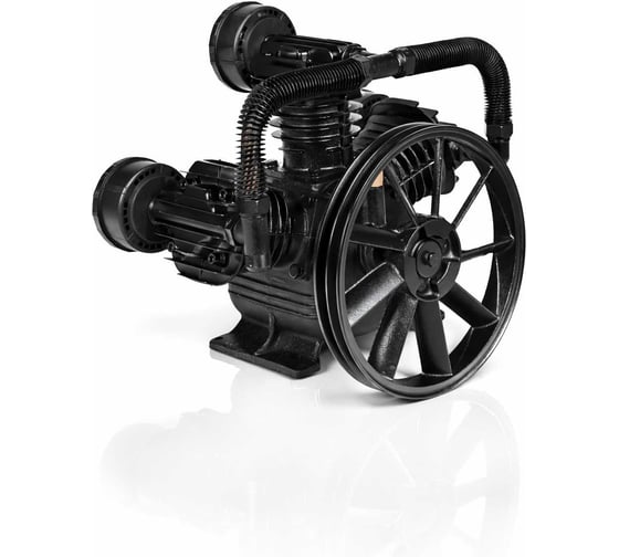 - Компрессорная голова рассчитана на работу с электродвигателем 5,5 кВт (380 В) и ременным приводом. В комплект входит шкив с вентиляционными лопастями для дополнительного охлаждения, три воздушных фильтра и масло для обкатки. Разборная конструкция обеспечивает удобное обслуживание и доступность запасных частей стандартного размера Ø90 мм.