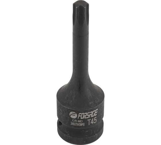 Головка-бита TORX ударная 45 мм 1/2" от бренда Forsage предназначена для работы с крепежными элементами, имеющими форму шлица TORX. Этот инструмент является необходимым атрибутом для специалистов, работающих с автомобилями и строительной техникой, благодаря своей высокой прочности и надежности.