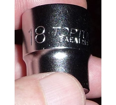Не могу сказать о ситуаций типа через трубу крутил. Только пока по внешнему виду. Головка аккуратная, цифра 18 очень крупная, не надо приглядываться. Как у большинства головок с Тайваня нет накатки, гладкая. Лыски фиксации на глубине в соответствии с расположением шарика воротка. Минимальная толщина стенки 2,4мм. Ниже лысок в квадрате поверхность необработанная и она по размеру больше, чем заход, т.е. передача усилия на квадрат происходит только по глубину лысок. Это к сведению тем, кто особое внимание обращает на диаметр хвостовика, посмотрите вовнутрь квадратного отверстия, будете удивлены. И такое вне зависимости от ярлыка на головке.