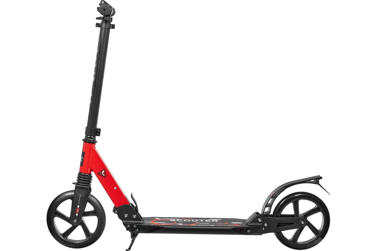 Преимущество данной модели – большие полиуретановые колеса 200 мм, крепкие подшипники ABEC-9 с амортизацией переднего и заднего колеса. Такое сочетание позволяет получить отличный накат и легко сглаживает все неровности дорожного покрытия. Заднее колесо городского самоката оснащено крылом-тормозом. Благодаря практичной складной подножке самокат можно припарковать без дополнительной опоры.
