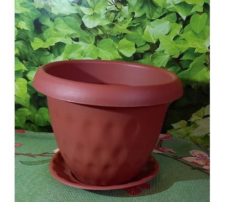 Небольшой горшок, выполнен из пластика. Имеются отверстия для слива, поддон. Цена была со скидкой.