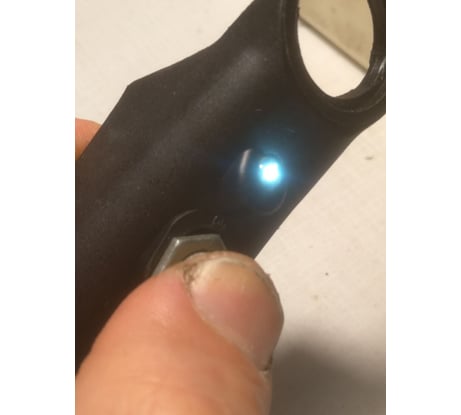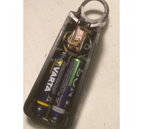 За такую цену очень достойно. Телескопический держатель фиксируется неплохо, вес инструмента держит. Гибкий вал не бьет, держать удобно. Превращение рукоятки в полноценный прибор подсветки заняло два часа. В качестве выключателя подошел советский микрик с кнопкой, снаружи притянул его штатной тонкой гайкой. Белый светодиод (диам. 5 мм) отпаял от какого-то сдохшего фонарика и немного опилил с боков, чтобы вставить на место. Он приемлемо светит при токе от 5 до 20 мА, чему соответствует напряжение 2,8-3,1 В, поэтому подключил его к сборке из двух батарей ААА 1,5 В без резистора. Зафиксировал термоклеем. Можно использовать и "Крону" с LED-драйвером на 20 мА (его цена 20-40 р.) или любой другой источник от 3 В, но тут уже есть пазы под ААА и контакты для них. Контакты изготовил из первой попавшейся пружинки. Также собираюсь нарастить высоту кольцевого прилива вокруг кнопки фиксации вала (приклею кольцо) для безопасной работы.