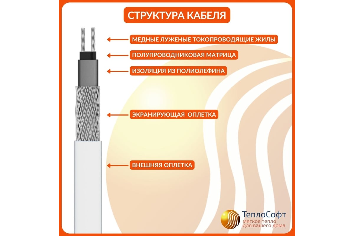 Экранированный саморегулирующийся греющий кабель Теплософт SRF 10-2 СТ предназначен для обогрева трубопровода и водостока внутри трубы.