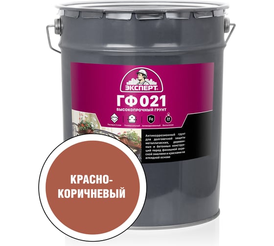Грунт Эксперт ГФ-021М красно-коричневый, 20 кг 15502 применяется для защиты от коррозии металлических деталей, изделий и конструкций, а также для грунтования деревянных поверхностей перед покрытием красками и эмалями.