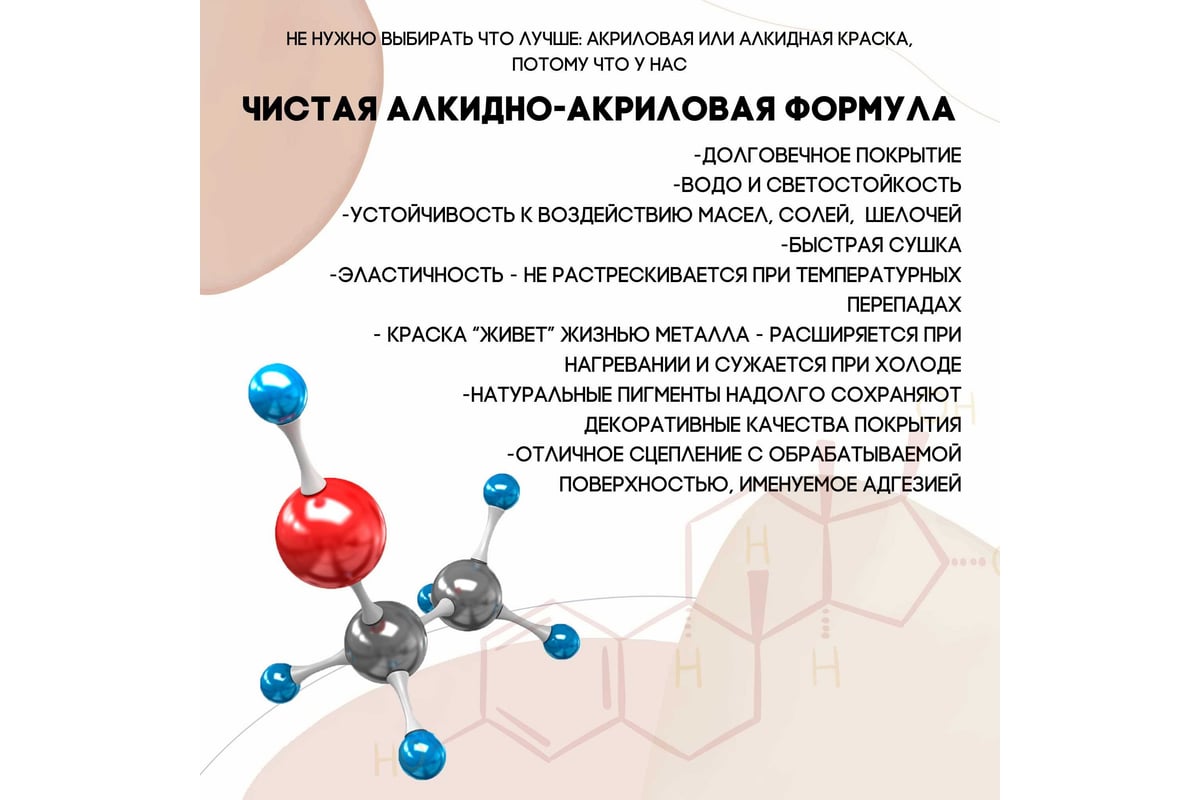 Применяется для окрашивания и антикоррозийной защиты поверхностей из черных и оцинкованных металлов и их сплавов, меди, алюминия, латуни, чугуна, а также дерева, бетона и камня, эксплуатируемых во всех климатических зонах в атмосферных условиях и внутри помещений, а также в условиях повышенной влажности и перепада температур. Покрытие устойчиво к воздействию ультрафиолетовых лучей, гидрофобно, обладает влагостойкостью и морозостойкостью.