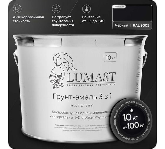 Грунт-эмаль 3 в 1 по ржавчине Lumast professional protection матовая, черная 10 кг 288M10K-9005