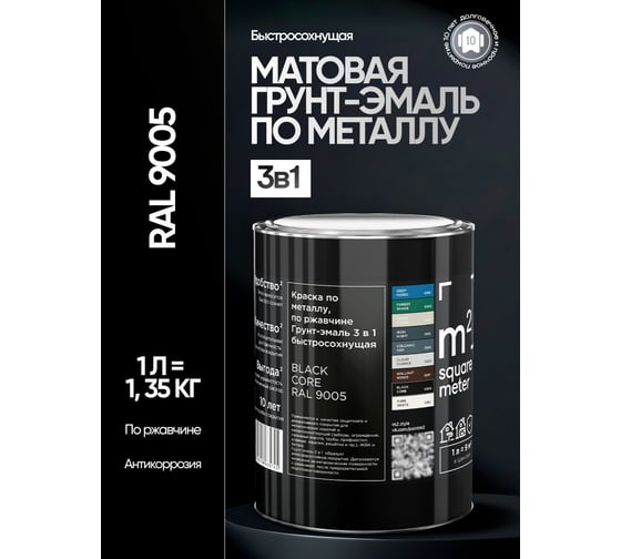 Грунт - эмаль 3 в 1 по ржавчине M2 SQUARE METER RAL 9005 Чёрный, 1л 10211000019005