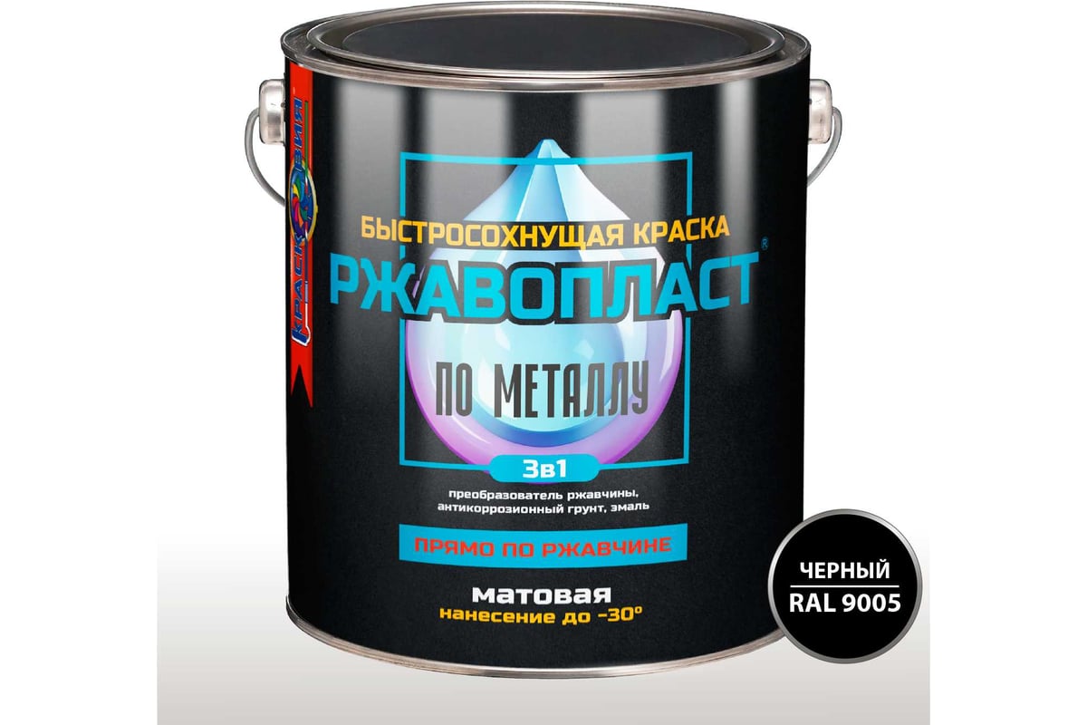 Грунт-эмаль «3в1» для металла прямо по ржавчине Красковия Ржавопласт RAL 9005 3кг быстросохнущая матовая УТ-38014594