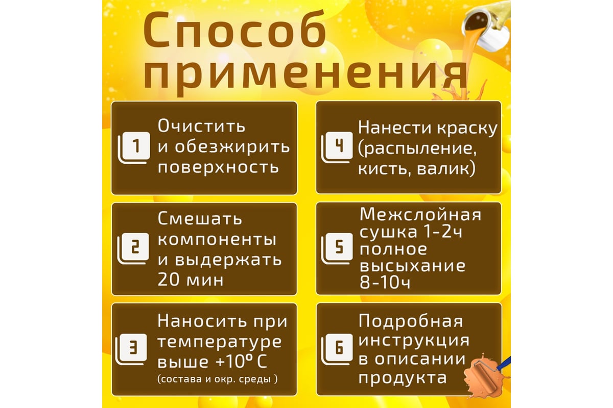 Прочность и эластичность. Покрытие образует прочную и эластичную плёнку, которая устойчива к механическим воздействиям, влаге и ультрафиолетовому излучению. Глянцевая поверхность. Эмаль обладает высокими декоративными свойствами и придаёт изделиям глянцевый блеск. Отличная адгезия. Материал хорошо сцепляется с различными поверхностями, обеспечивая надёжное и долговечное покрытие. Устойчивость к атмосферным воздействиям. Покрытие не боится перепадов температур, влажности и агрессивных сред, что делает его идеальным для использования на открытом воздухе. Быстрое высыхание. Время высыхания покрытия составляет всего 30 минут от пыли, 2 часа на отлип и 6 часов до монтажной твёрдости. Это позволяет значительно ускорить процесс обработки изделий. Обеспечивает равномерное нанесение и хорошую укрывистость.