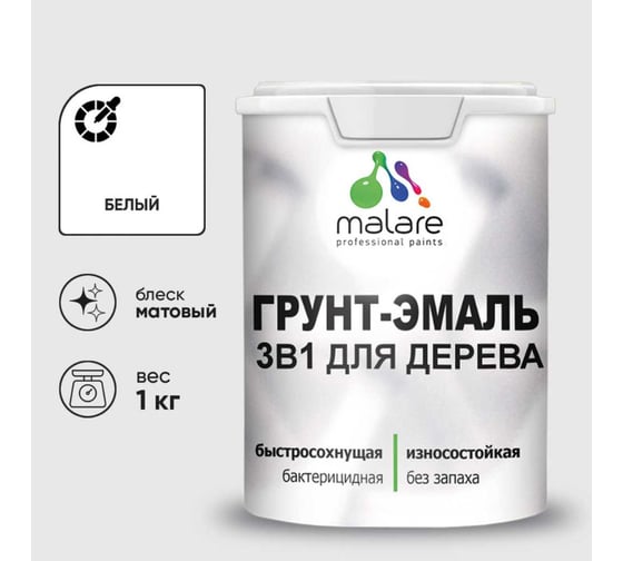 Грунт-Эмаль 3 в 1 для деревянных поверхностей MALARE, акриловая, моющаяся, без запаха, матовая, белая, 1 кг 7930085240875