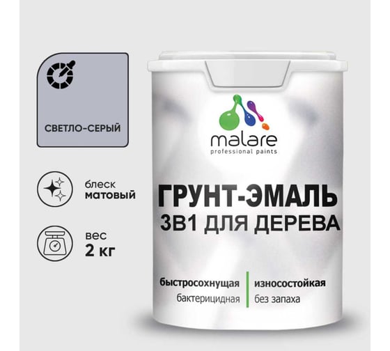 Грунт-Эмаль 3 в 1 для деревянных поверхностей MALARE, акриловая, моющаяся, без запаха, матовая, светло-серый, 2 кг 7930085240646