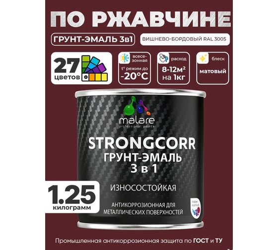 Грунт-эмаль 3 в 1 по ржавчине MALARE StrongCorr, алкидно-уретановая, полуматовая, вишнево-бордовый, 1,2 кг 2038119903651 ГЭСТР3005М0125