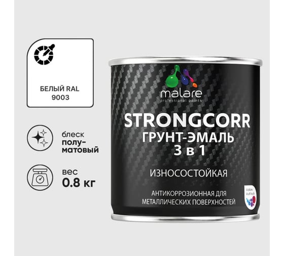 Грунт-Эмаль 3 в 1 по ржавчине MALARE StrongCorr, алкидно-уретановая, полуматовая, белый, 0,8 кг 7930085244316