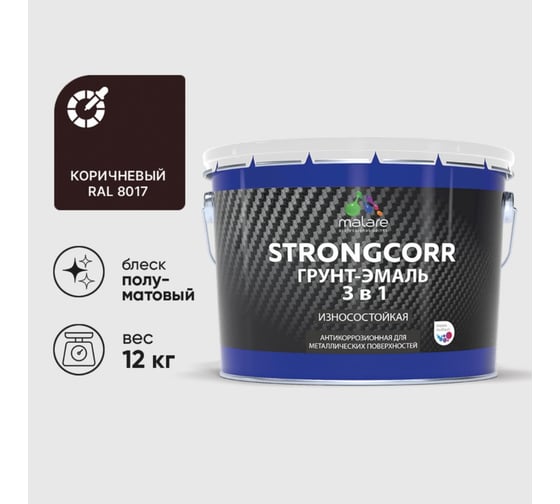 Грунт-Эмаль 3 в 1 по ржавчине MALARE StrongCorr, алкидно-уретановая, полуматовая, коричневый, 12,4 кг 7930085244286