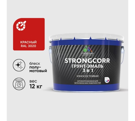 Грунт-Эмаль 3 в 1 по ржавчине MALARE StrongCorr, алкидно-уретановая, полуматовая, красный, 12,4 кг 7930085243937