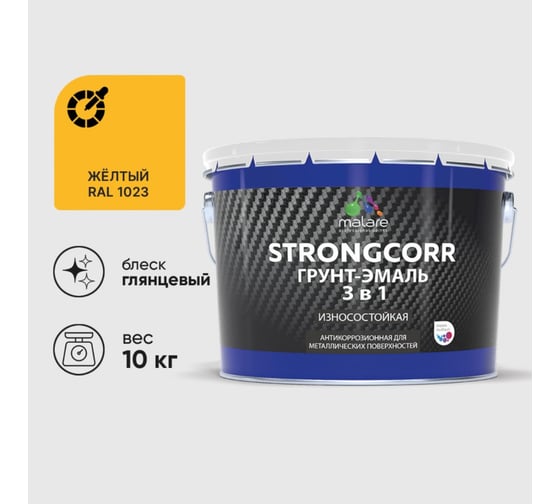 Грунт-Эмаль 3 в 1 по ржавчине MALARE StrongCorr, алкидно-уретановая, глянцевая, желтый, 10 кг 7930085243258