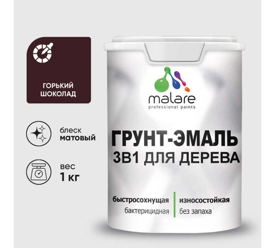 Грунт-Эмаль 3 в 1 для деревянных поверхностей MALARE, акриловая, моющаяся, без запаха, матовая, горький шоколад, 1 кг 2036766260714