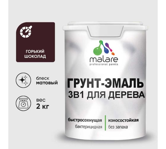 Грунт-Эмаль 3 в 1 для деревянных поверхностей MALARE, акриловая, моющаяся, без запаха, матовая, горький шоколад, 2 кг 2036766260950