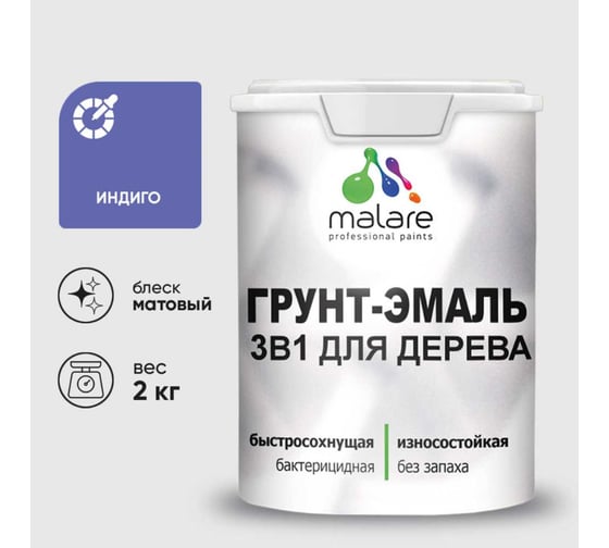 Грунт-Эмаль 3 в 1 для деревянных поверхностей MALARE, акриловая, моющаяся, без запаха, матовая, индиго, 2 кг 2036752169854