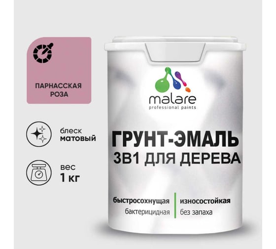 Грунт-Эмаль 3 в 1 для деревянных поверхностей MALARE, акриловая, моющаяся, без запаха, матовая, парнасская роза, 1 кг 2036753851802