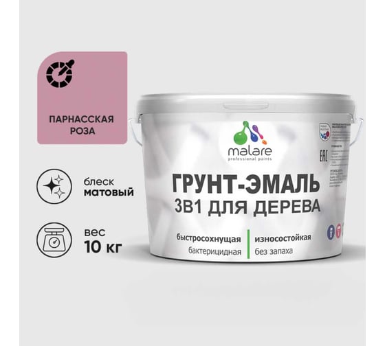 Грунт-Эмаль 3 в 1 для деревянных поверхностей MALARE, акриловая, моющаяся, без запаха, матовая, парнасская роза, 10 кг 2036753851642