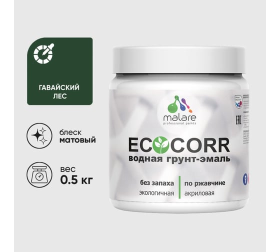 Грунт-Эмаль MALARE 3в1 EcoCorr для металлических поверхностей, акриловая быстросохнущая без запаха, матовая, гавайский лес, 0,5 кг 4610362815783