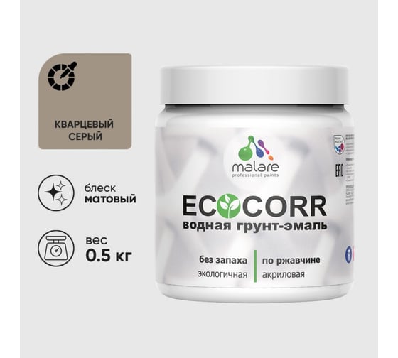 Грунт-Эмаль MALARE 3в1 EcoCorr для металлических поверхностей, акриловая быстросохнущая без запаха, матовая, кварцевый серый, 0,5 кг 4610362815912