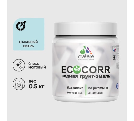 Грунт-Эмаль MALARE 3в1 EcoCorr для металлических поверхностей, акриловая быстросохнущая без запаха, матовая, сахарный вихрь, 0,5 кг 4610362816223