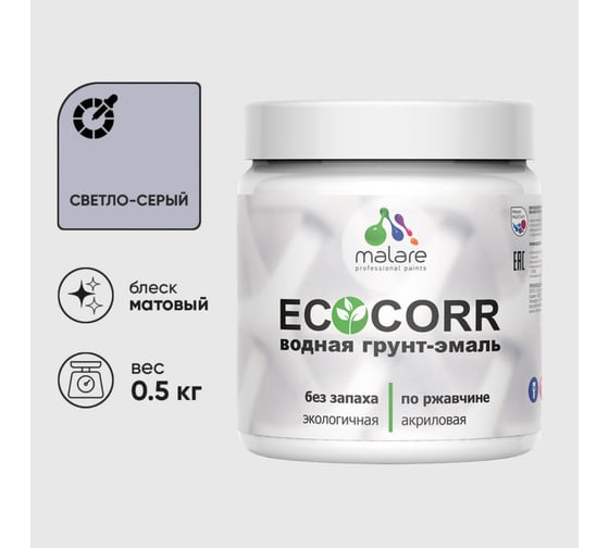 Грунт-Эмаль MALARE 3в1 EcoCorr для металлических поверхностей, акриловая быстросохнущая без запаха, матовая, светло-серая, 0,5 кг 4610362816261