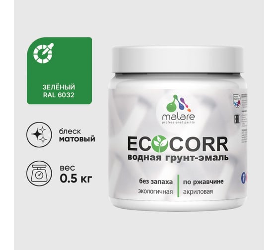 Грунт-Эмаль MALARE 3в1 EcoCorr для металлических поверхностей, акриловая быстросохнущая без запаха, матовая, зеленая, 0,5 кг 4610362815882