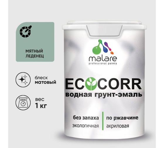 Грунт-Эмаль 3в1 матовая мятный леденец акриловая быстросохнущая без запаха для металлических поверхностей MALARE EcoCorr 1 кг 7930085242657