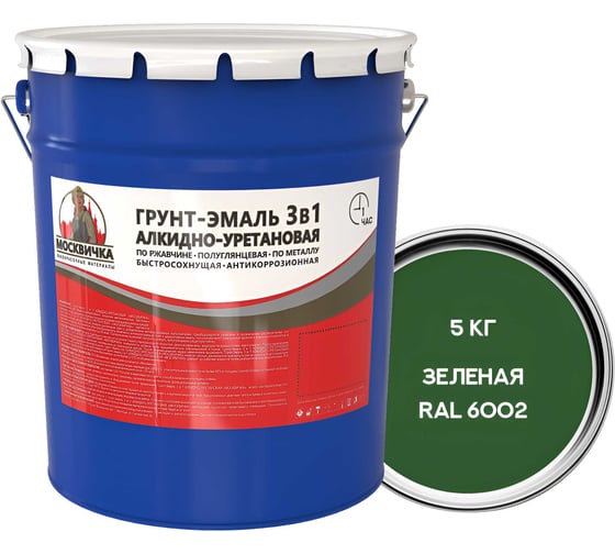 Грунт-эмаль Москвичка алкидно-уретановая, 3 в 1, зеленая ral 6002, 5 кг 4620105773867