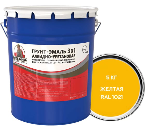 Грунт-эмаль Москвичка алкидно-уретановая, 3 в 1, желтая ral 1021, 5 кг 4620105773850