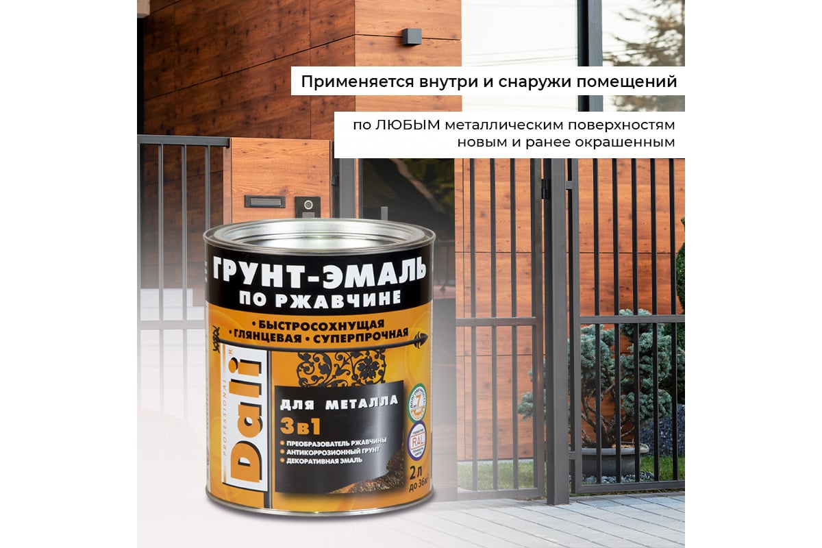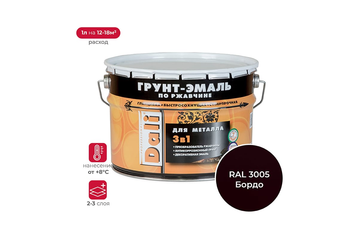 Грунт-эмаль по ржавчине 3 В 1DALI Винно-Красный RAL 3005 10 л 1 45821