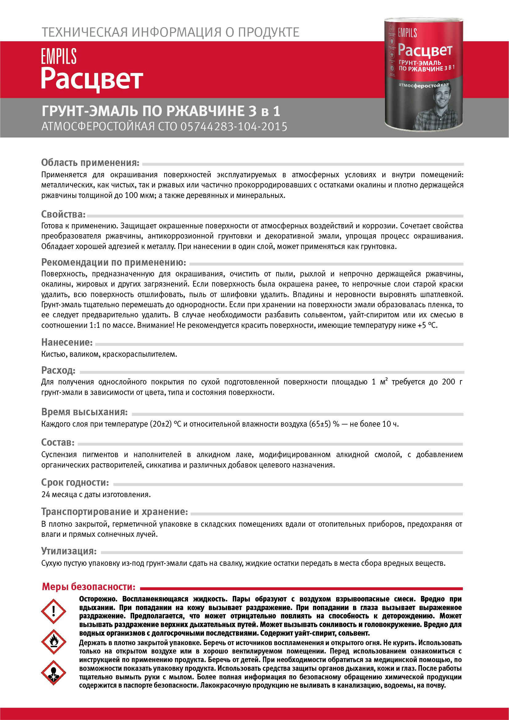 Грунт-эмаль по ржавчине Расцвет алкидная, зеленая, 17 кг 65659 применяется для окрашивания поверхностей, эксплуатируемых в атмосферных условиях и внутри помещений: металлических, как чистых, так и ржавых (плотно держащаяся ржавчина толщиной до 100 мкм), а также деревянных и минеральных.