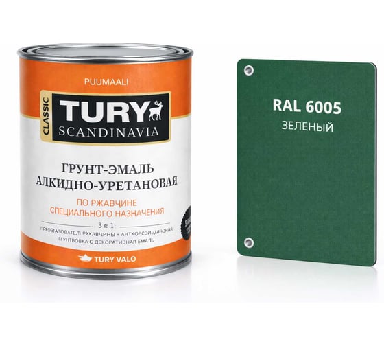 Грунт-эмаль TURY АУ по ржавчине 3 в 1, зеленая (RAL 6005), 2 кг T1-00007182 применяется для антикоррозионной защиты новых и старых металлических поверхностей из стали и других черных металлов, очистка которых от ржавчины затруднена. Допускает нанесение на плотно держащуюся ржавчину (слой до 100 мкм). Служит для окраски металлоконструкций, гаражей, крыш, решеток.