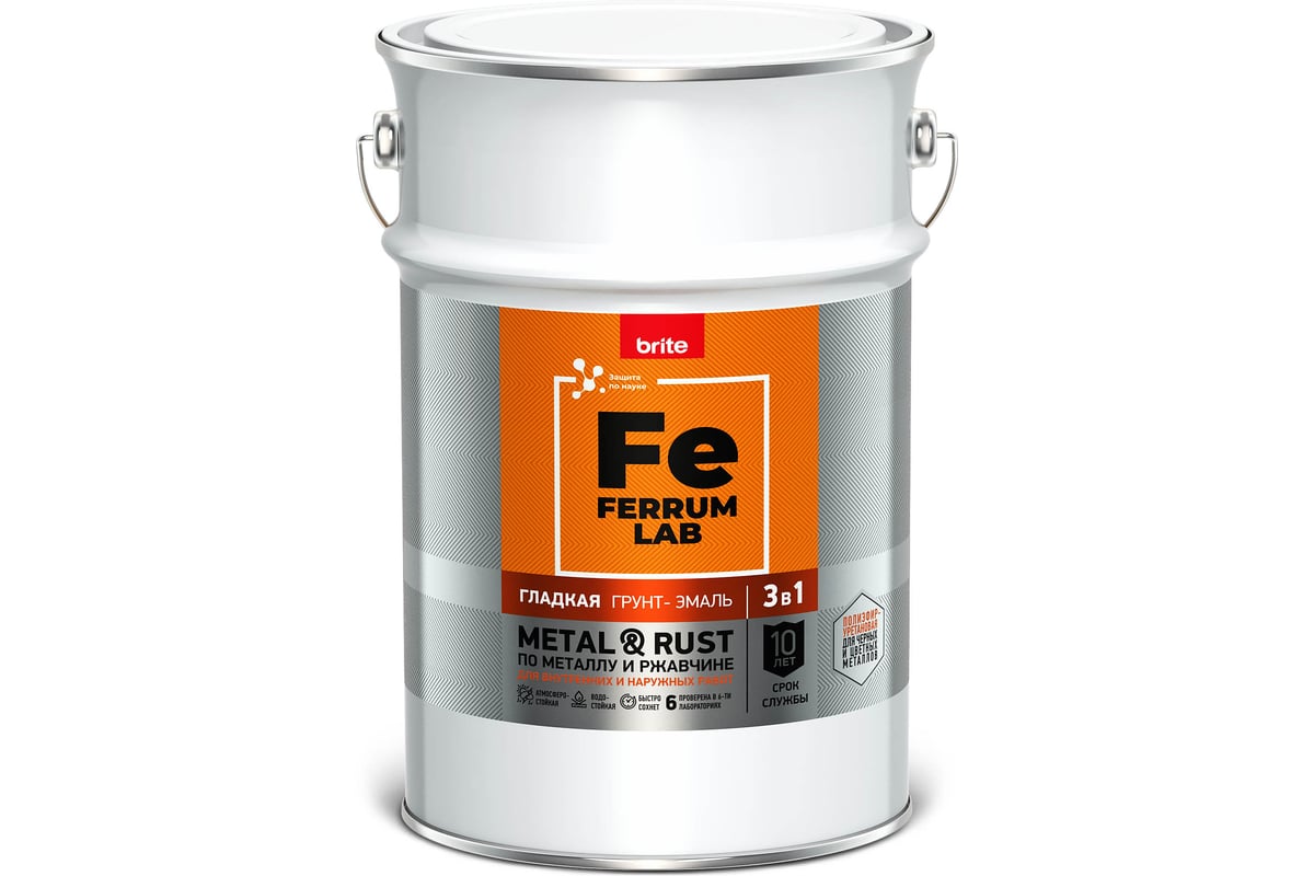 Грунт-эмаль по ржавчине 3 в 1 гладкая для черных металлов (железо, сталь, чугун) чистых и с продуктами точечной, сплошной коррозии, с остатками старого покрытия, плотно сцепленных с металлом (после предварительного окрашивания на совместимость на объекте). Содержит микронизированный фосфат цинка. Свойства: высокое противокоррозионное действие; низкая токсичность; улучшает адгезию; повышает защитные свойства лакокрасочного покрытия