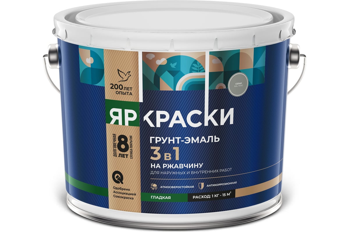 Грунт-эмаль ЯРОСЛАВСКИЕ КРАСКИ ЯРКРАСКИ на ржавчину 3 в 1 гладкая серая RAL 7040, барабан 10 кг, 221330
